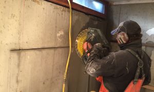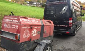 Først må det måles opp og dekkes til. Det blir naturlig nok en del "søl" av betongboringen når man bruker vann. Strømaggregatet er på plass